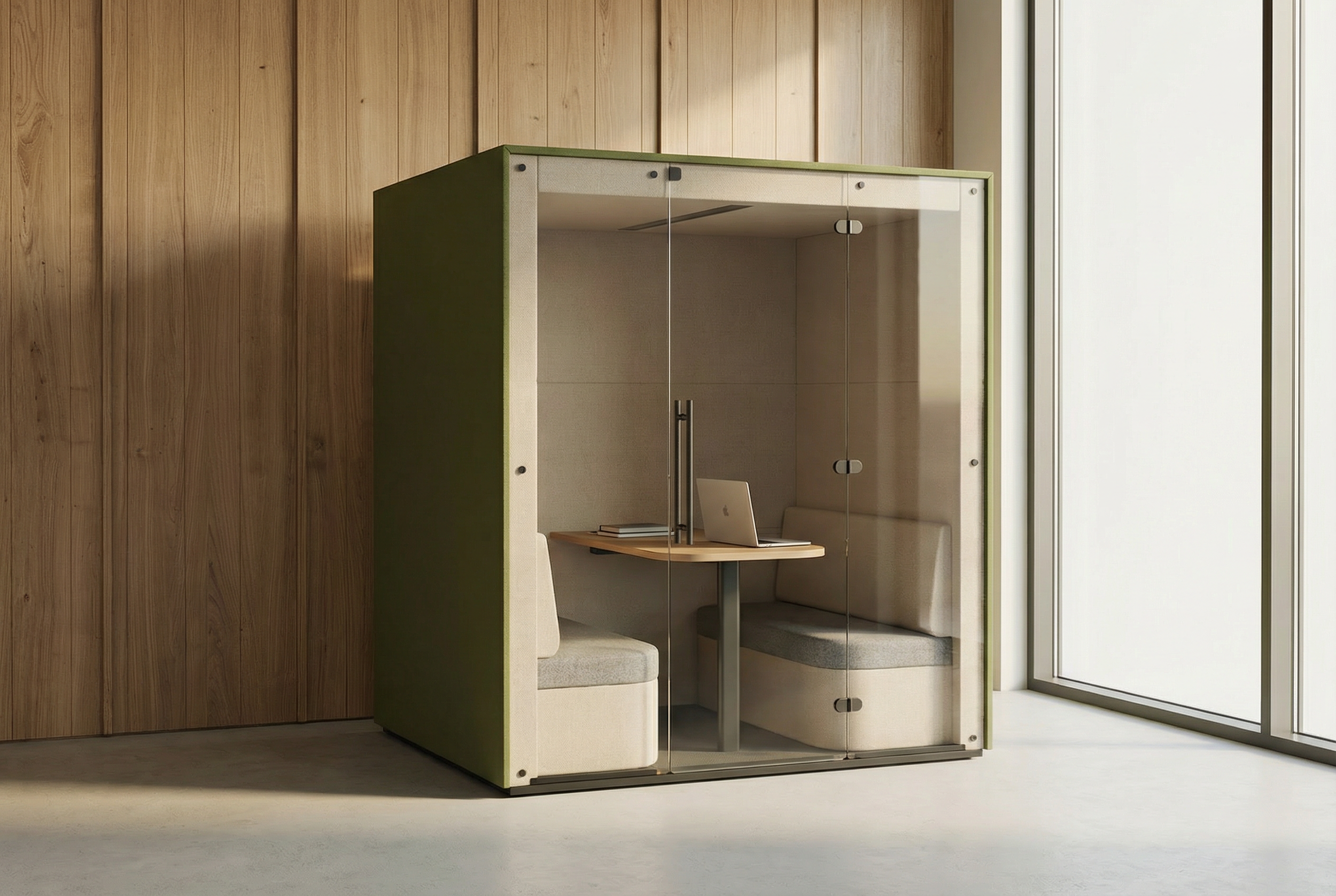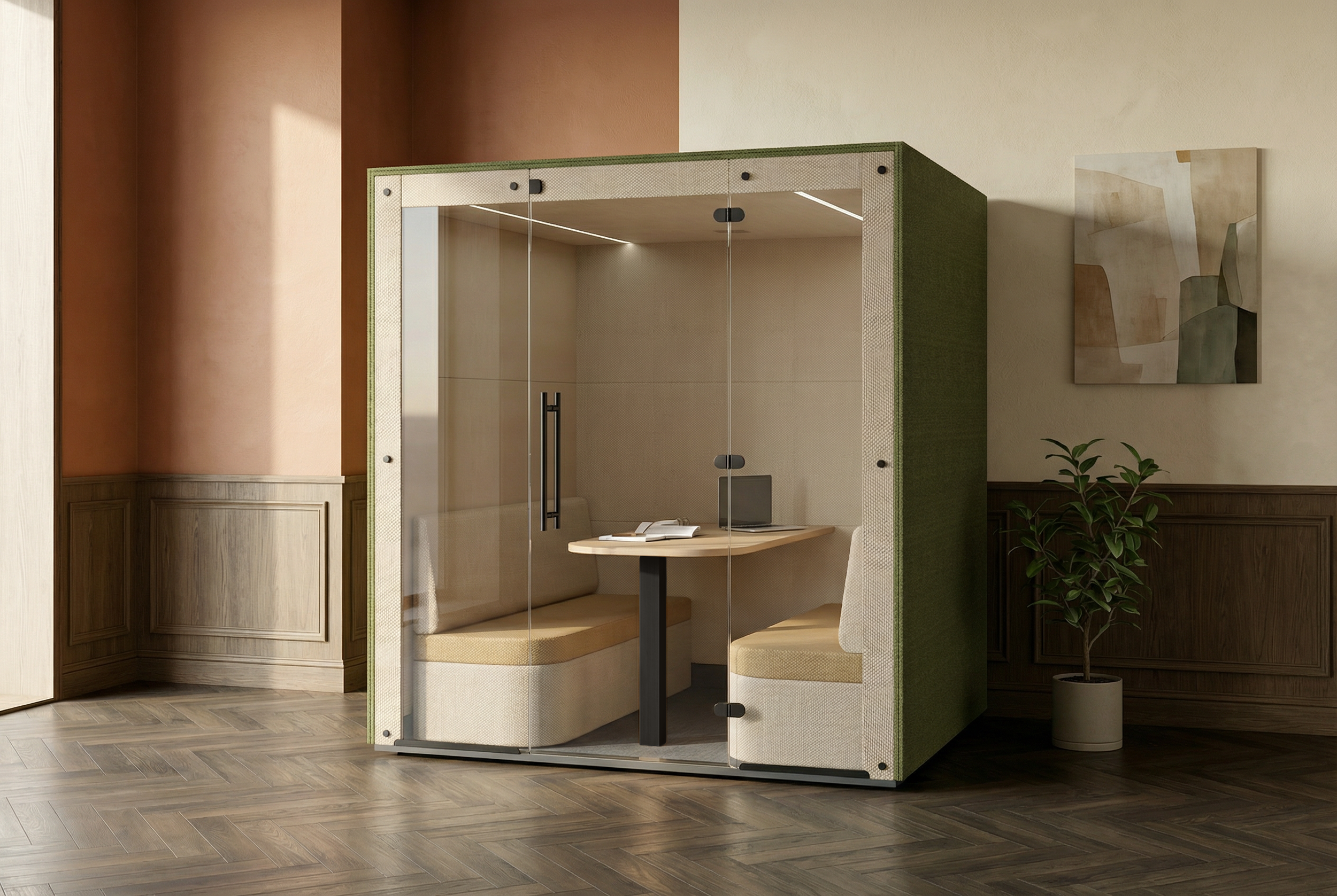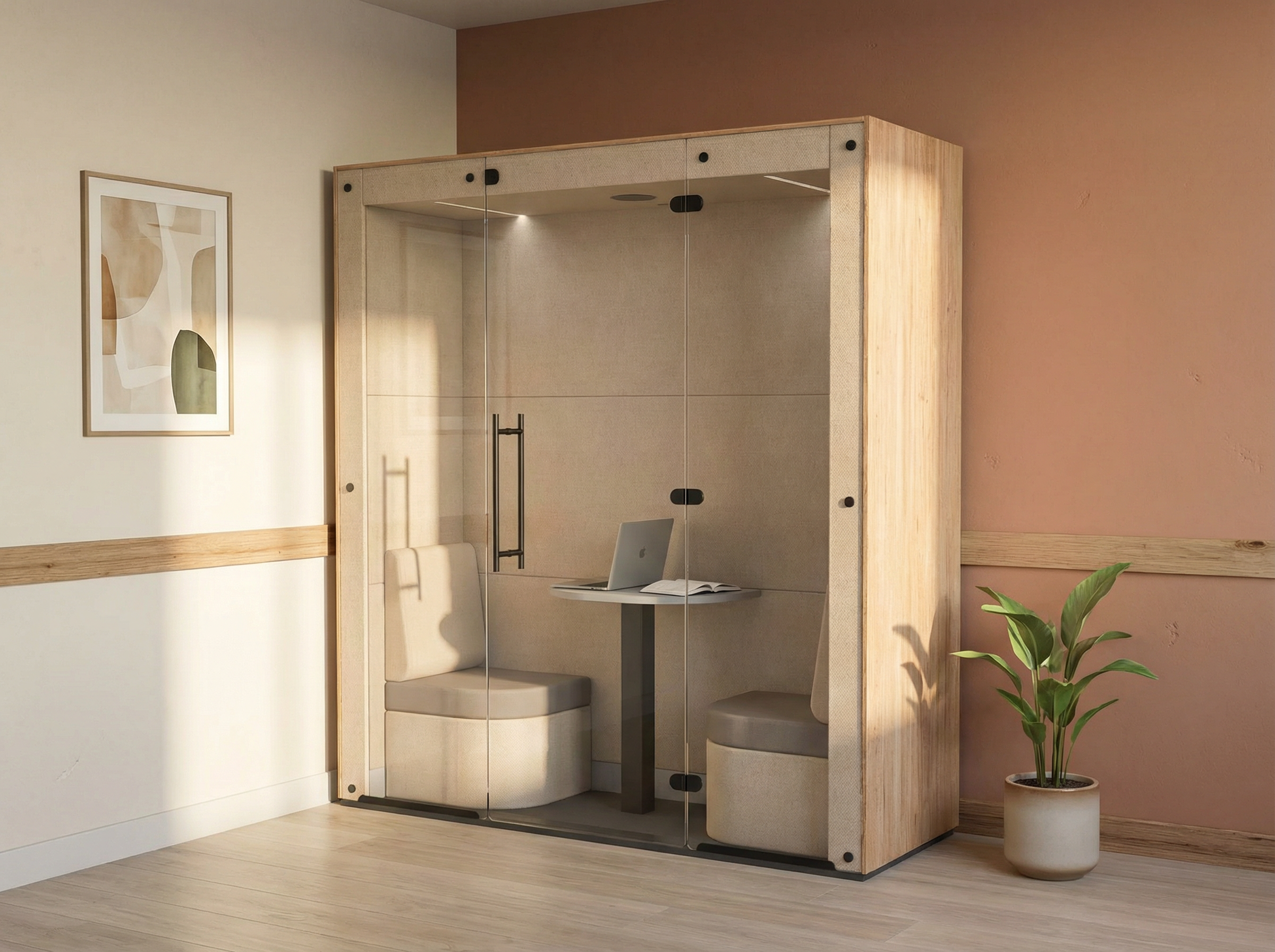 Redefine your workflow with a work-booth designed to transport you to your own private meeting room.