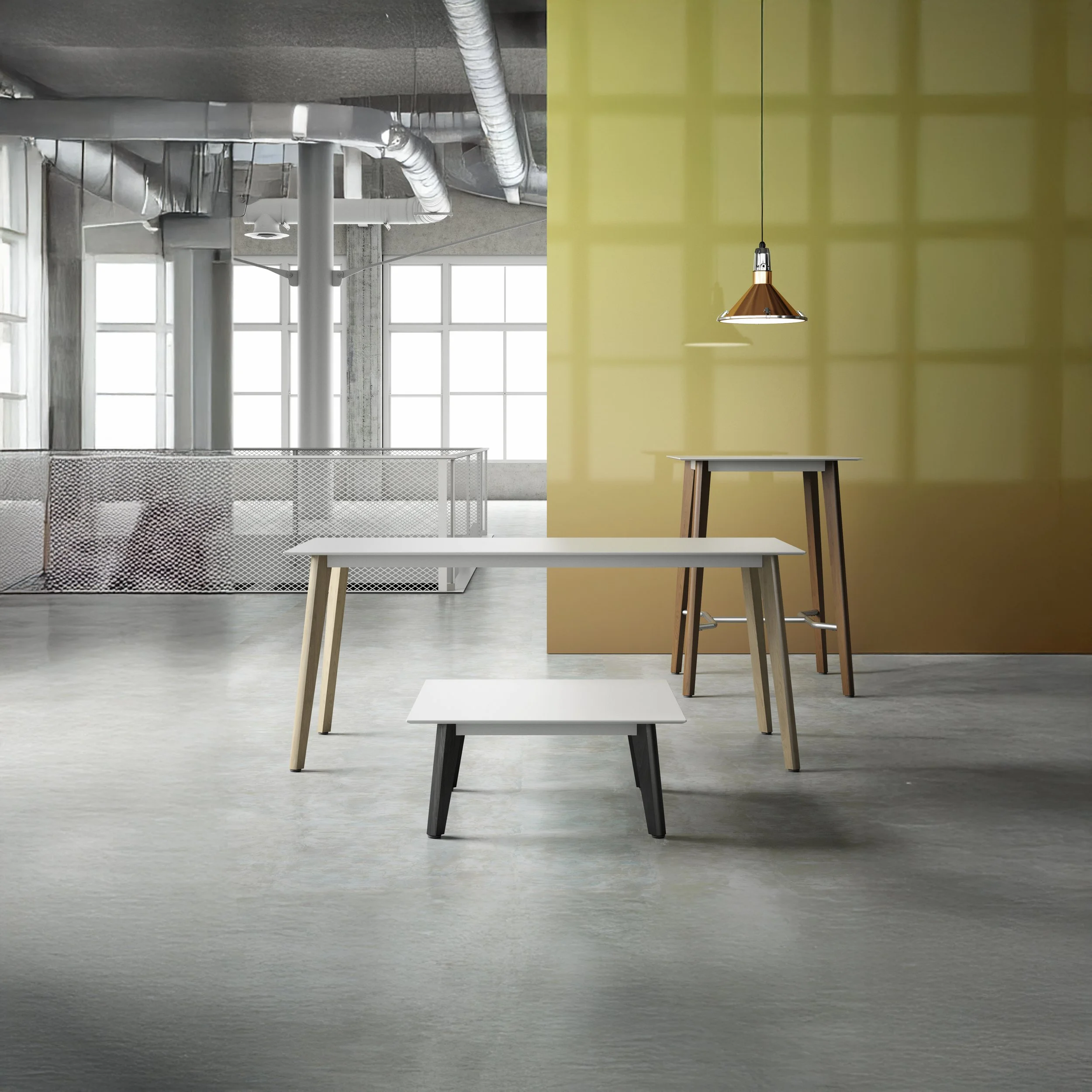 With the increase of workplaces seeking a more diverse, intelligent approach to desking and agile working, Native is designed to provide an alternative place of working, meeting and collaborating. The timber-framed table range offers several shape and height configurations, including circular, square, rectangular, and squarial shaped tops, in coffee, lounge, dinning and poseur heights, all available in numerous MFC finishes. The base frames are available in three wood stains, oak, walnut and black.